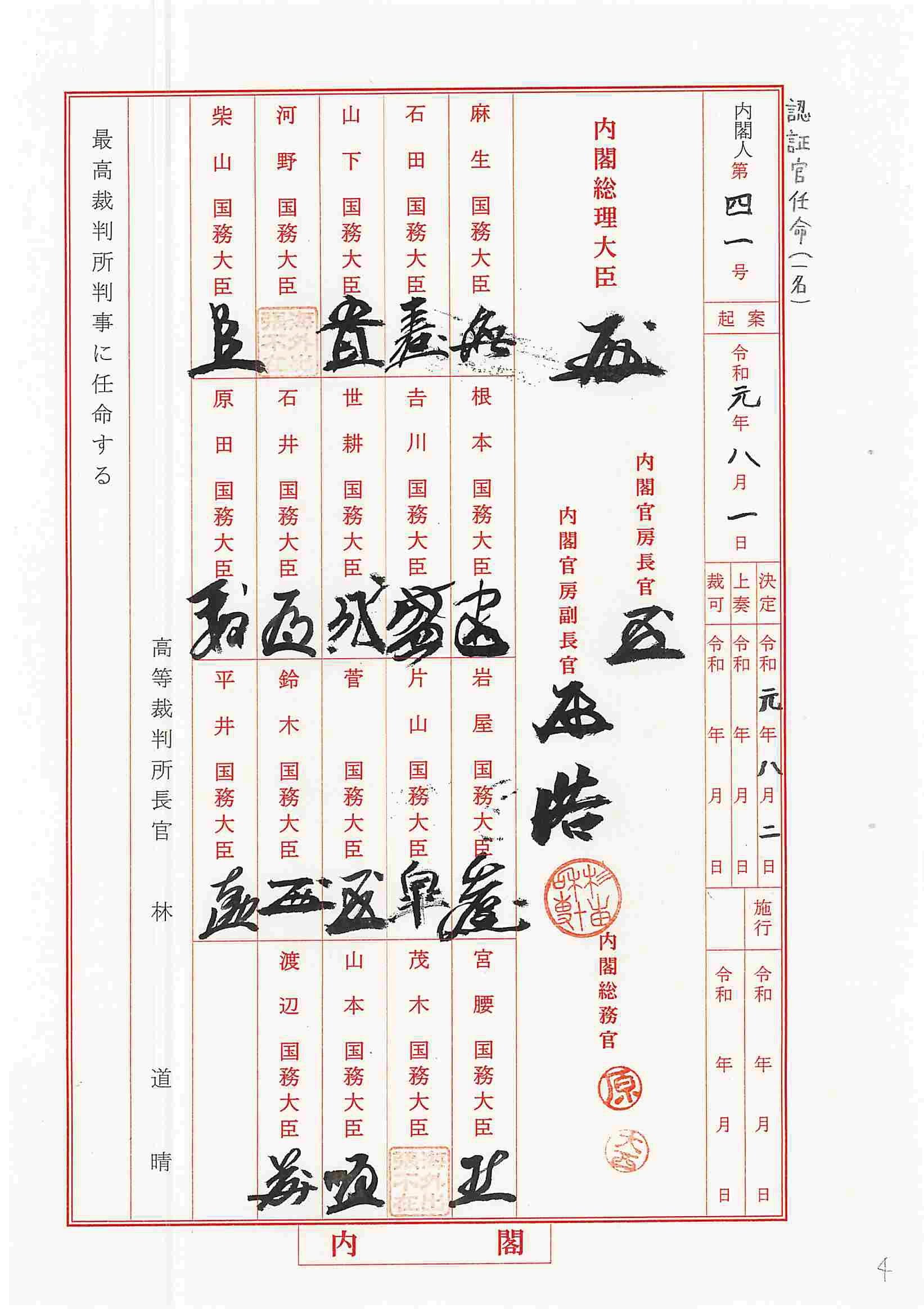 林道晴最高裁判事,今崎幸彦東京高裁長官等の任命に関する裁可書(令和元年9月2日付)を添付しています。 pic.twitter.com/mpeVkwSNTe