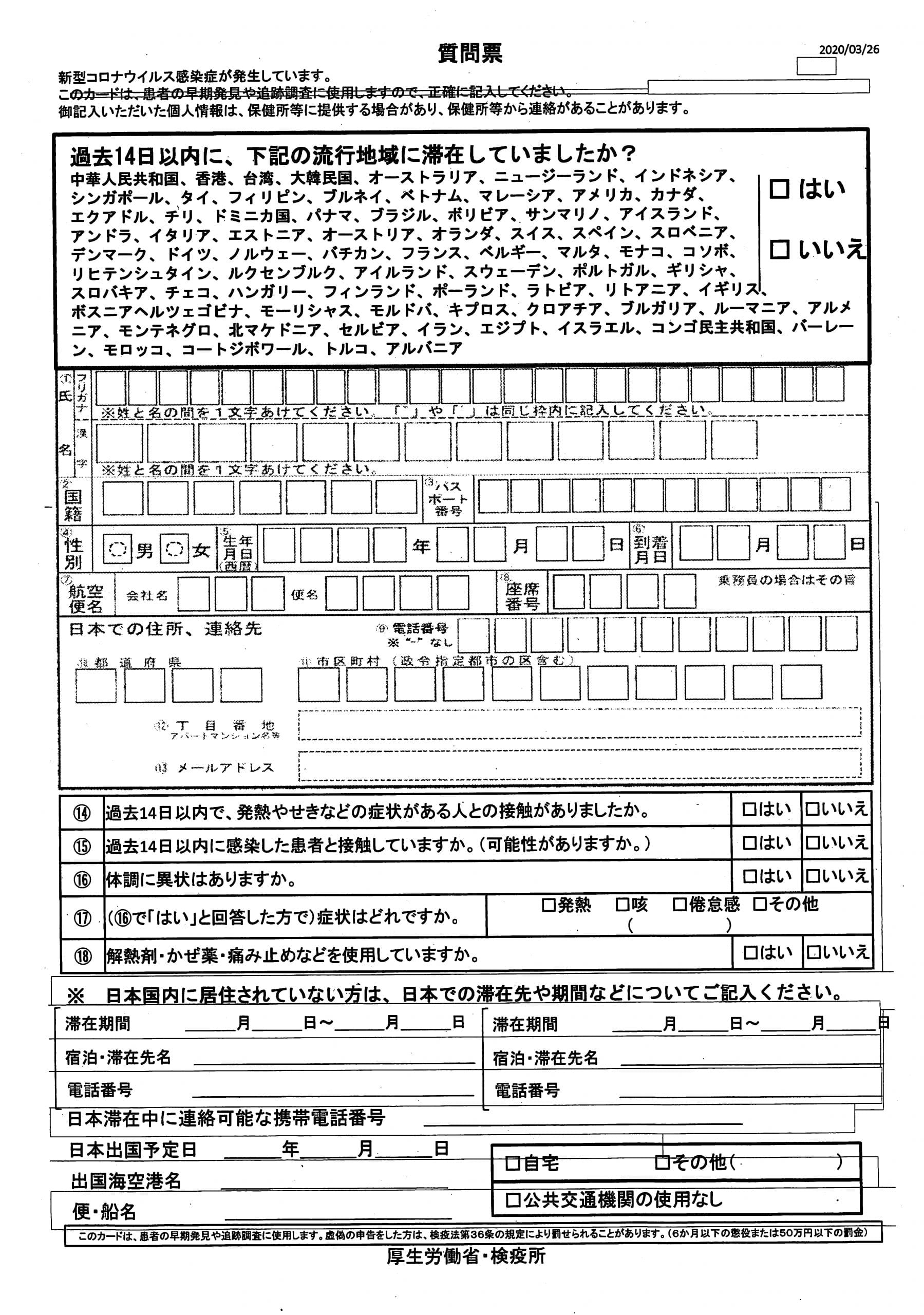 ・ 新型コロナウイルス感染症発生国からの入国者に対する検疫対応について(流行地域の追加)(令和2年4月2日付の厚生労働省健康局結核感染症課等の事務連絡)
