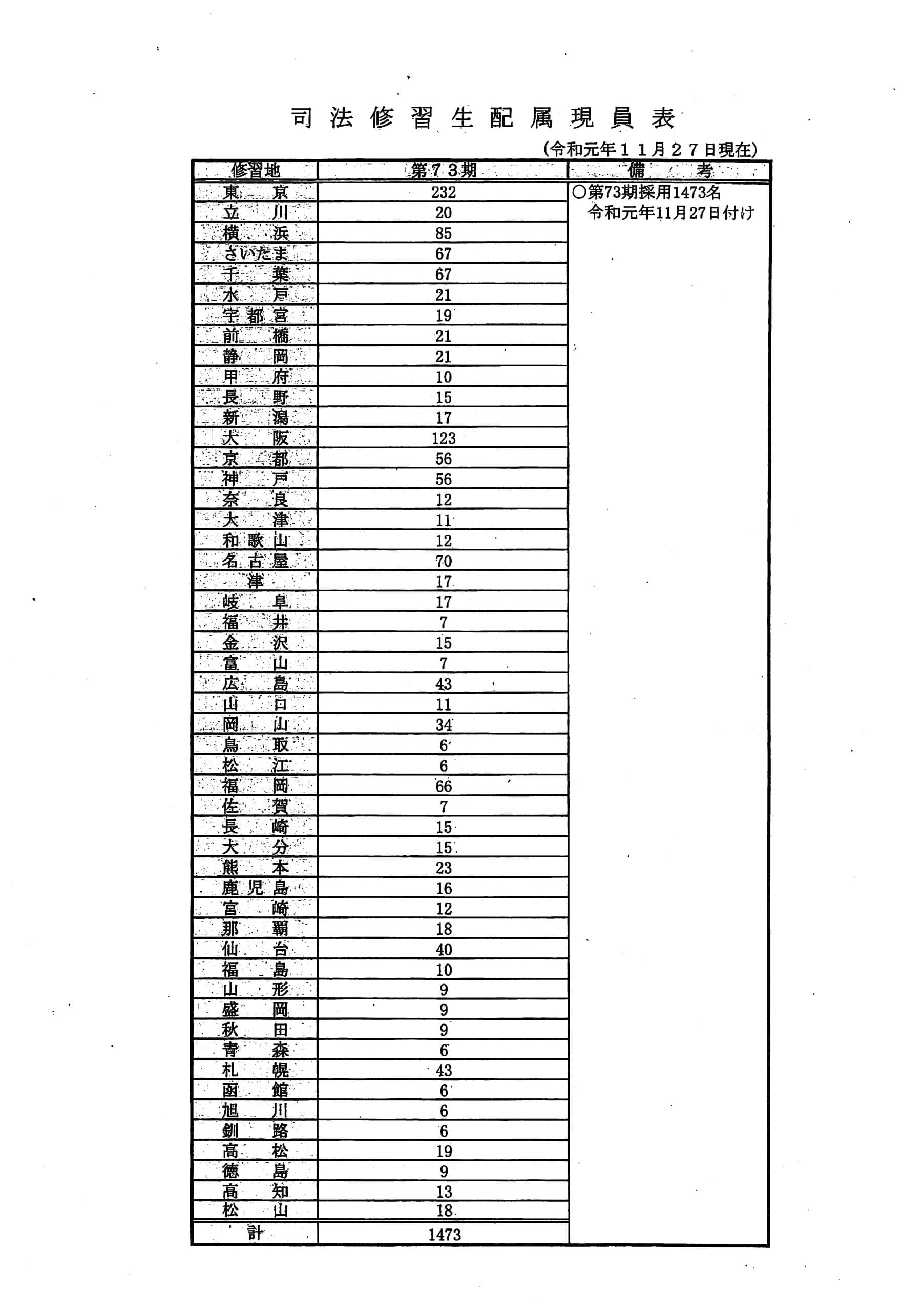 73期司法修習生配属現員表(令和元年11月27日現�...