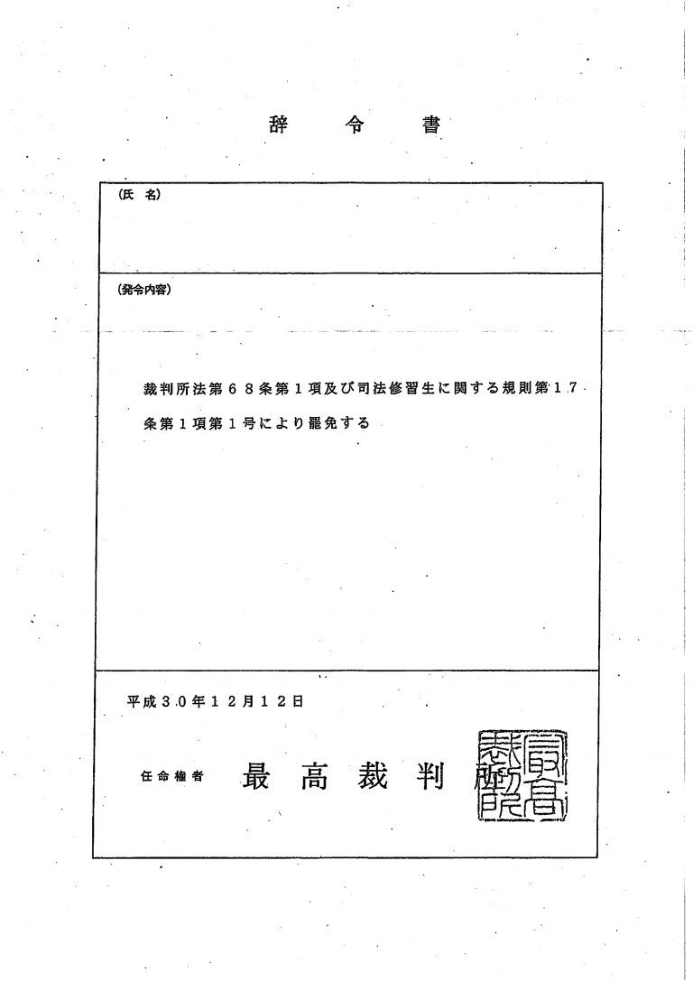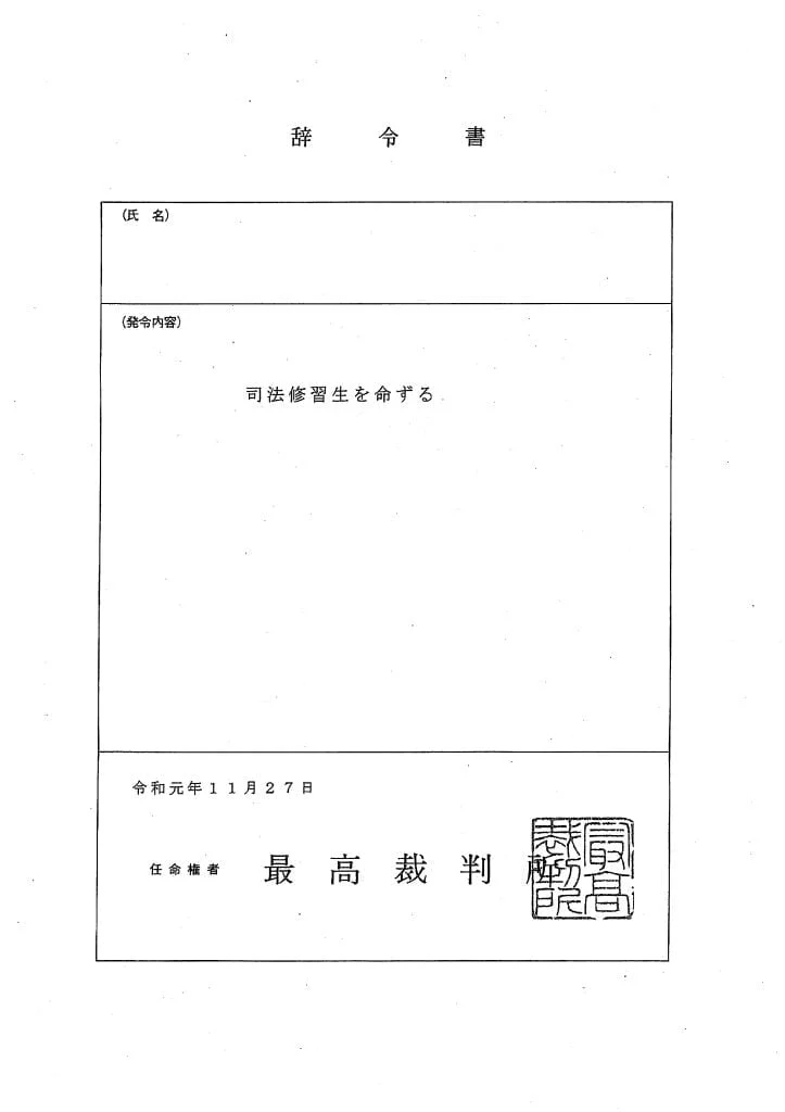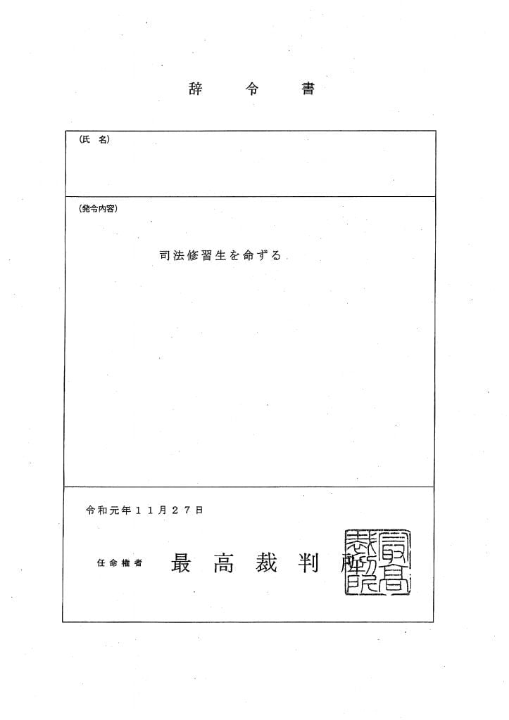 73期司法修習生採用の辞令書(令和元年11月27日�...