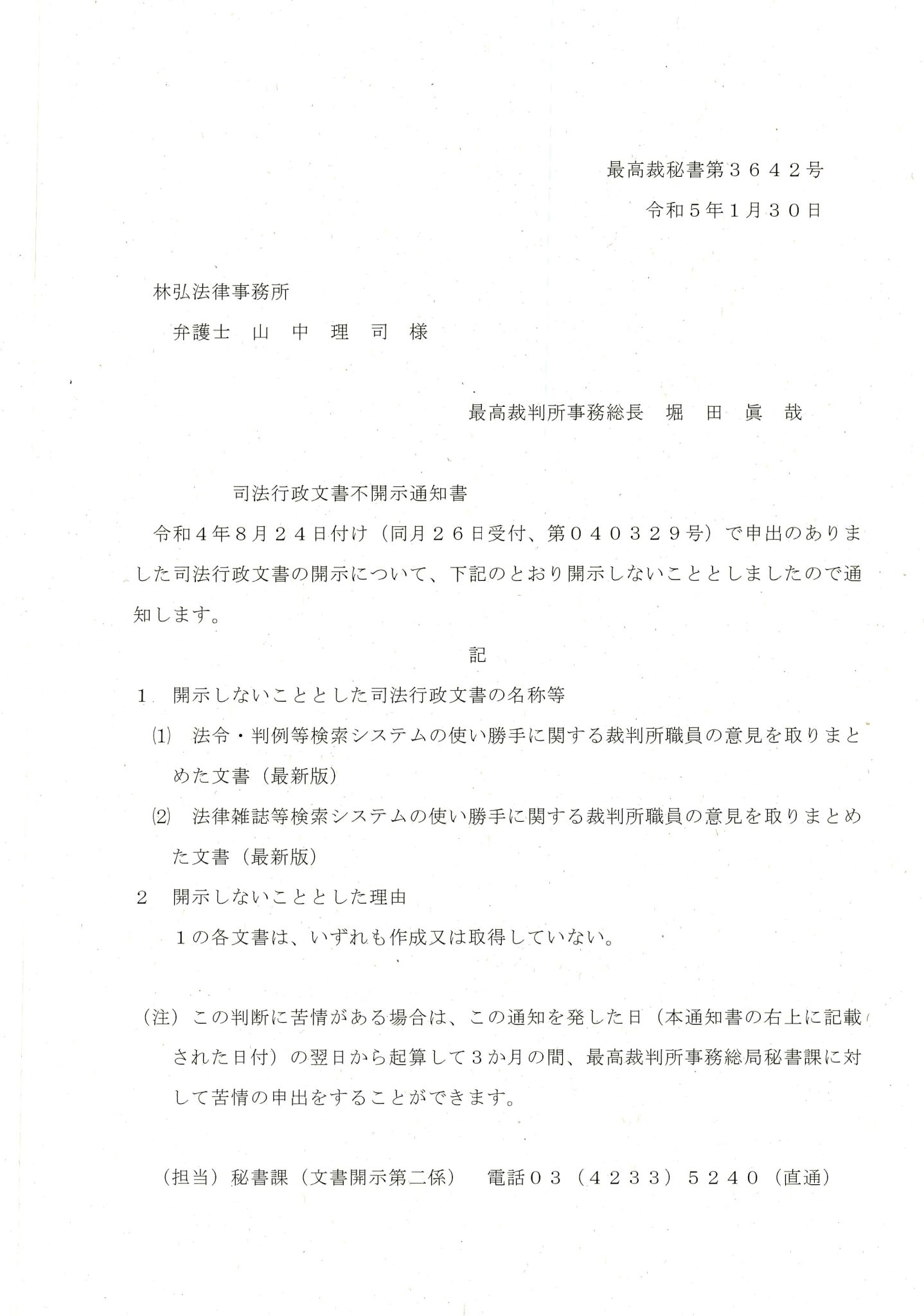 R031217-最高裁の不開示通知書(最高裁秘書課の,儀式典礼...