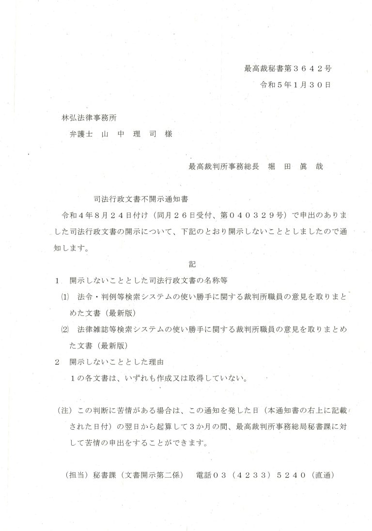 R031201-最高裁の不開示通知書(令和3年9月に実施された...