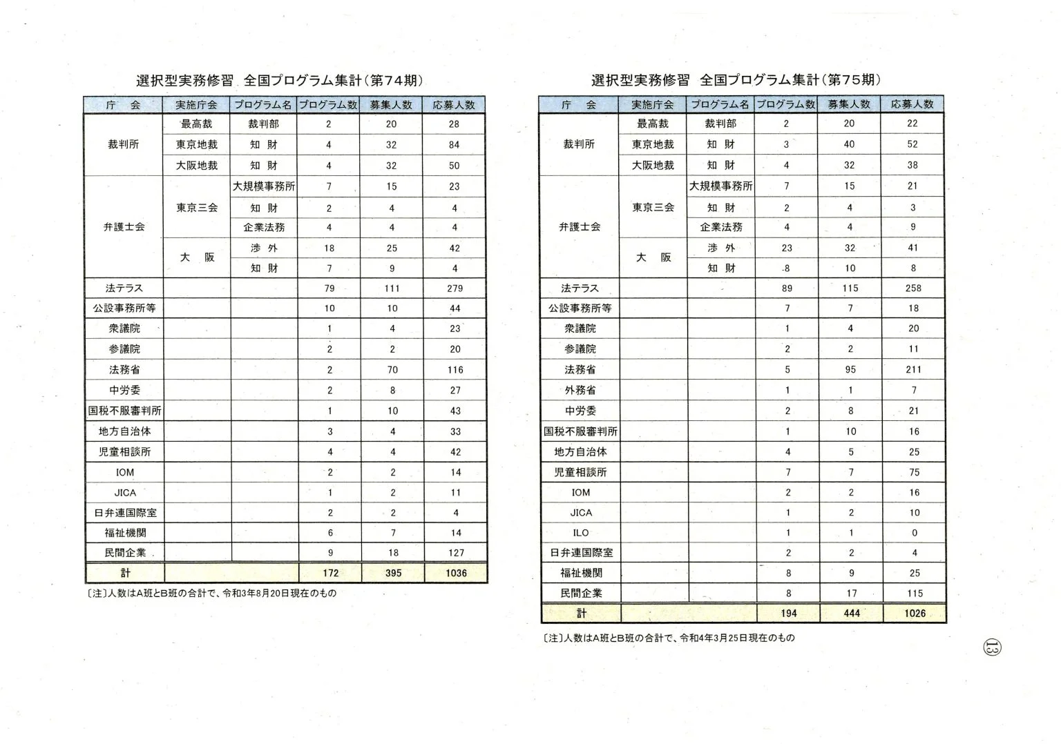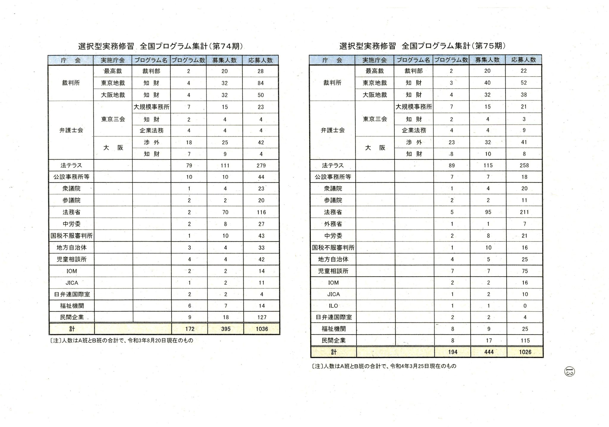 選択型実務修習 全国プログラム集計(74期及び75�...