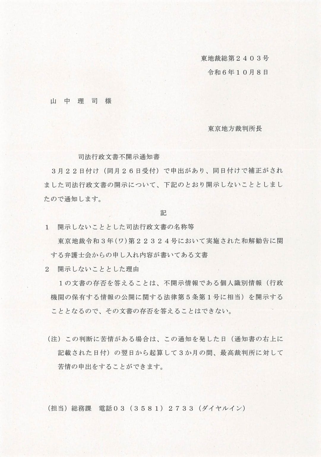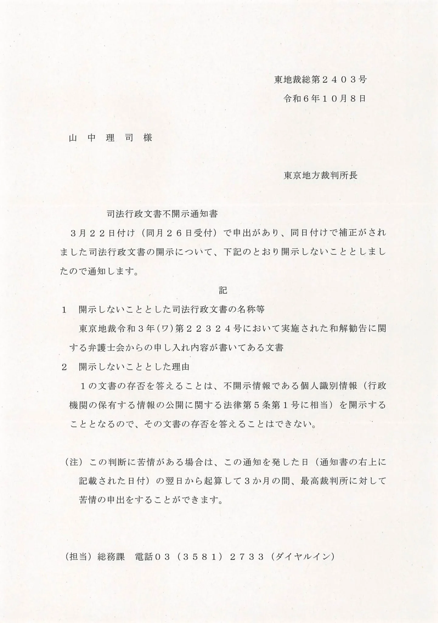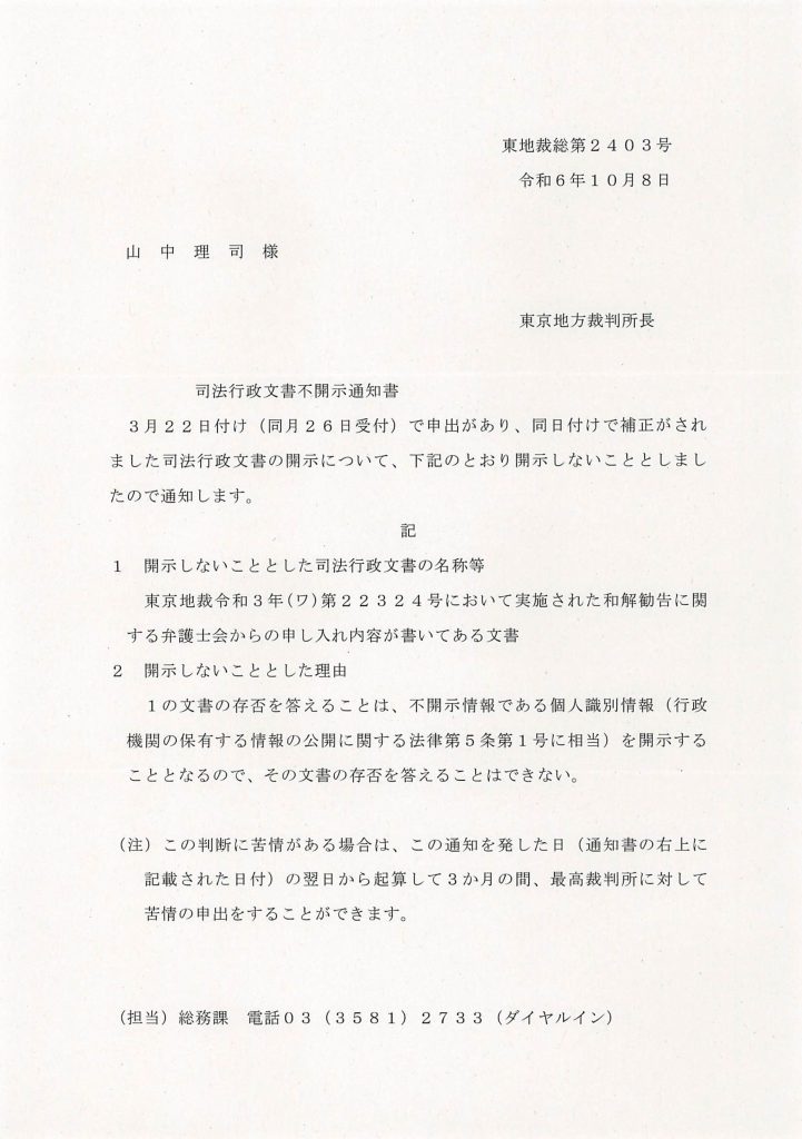 R061008-東京地裁の不開示通知書(弁護士会からの申し入れ...